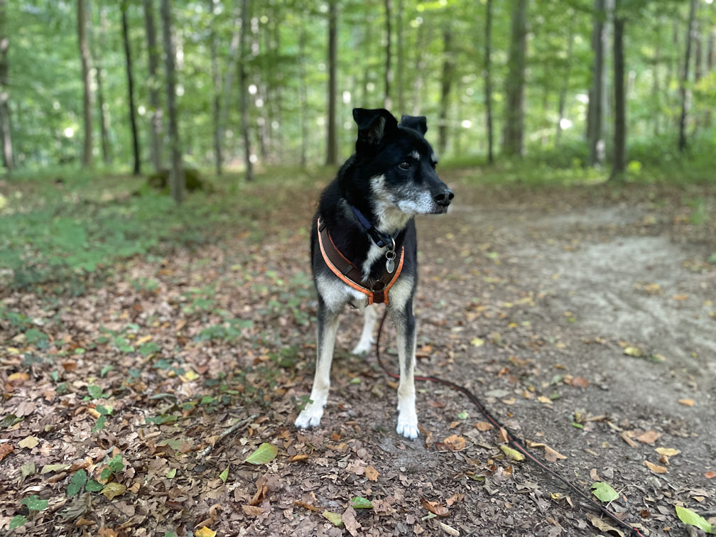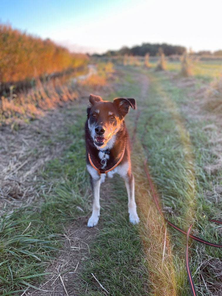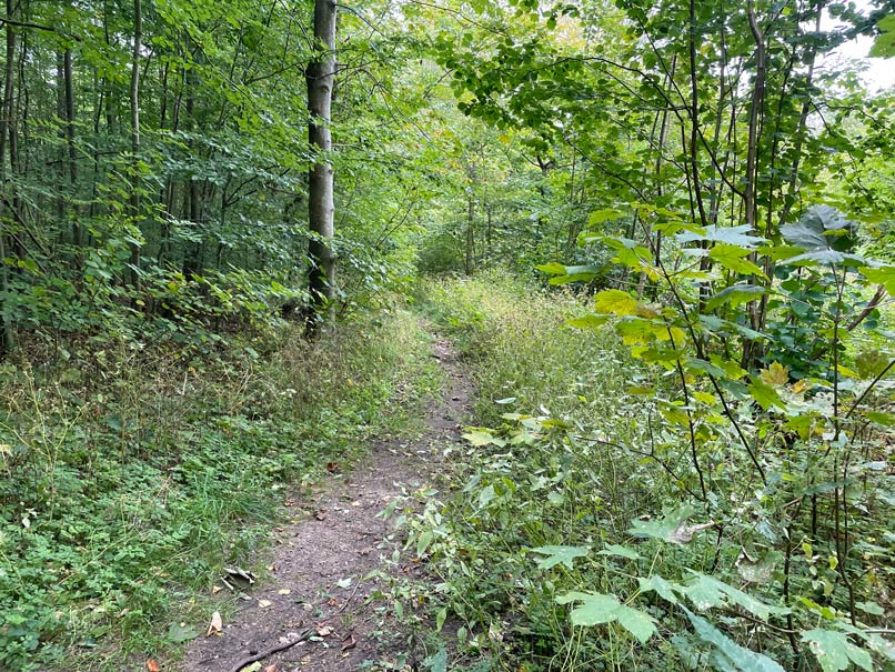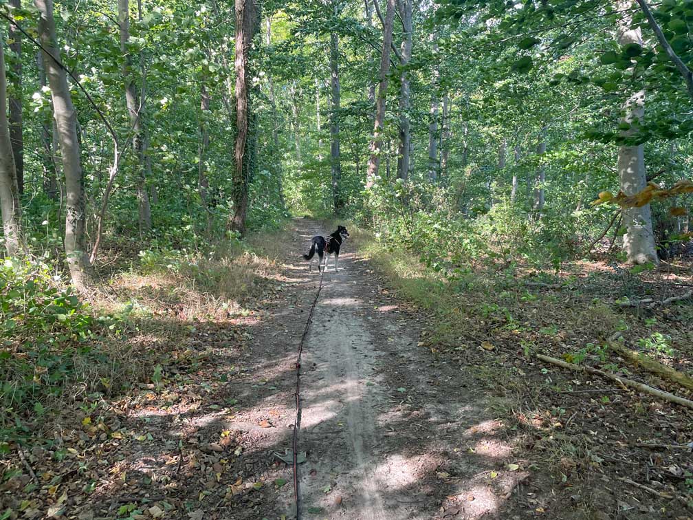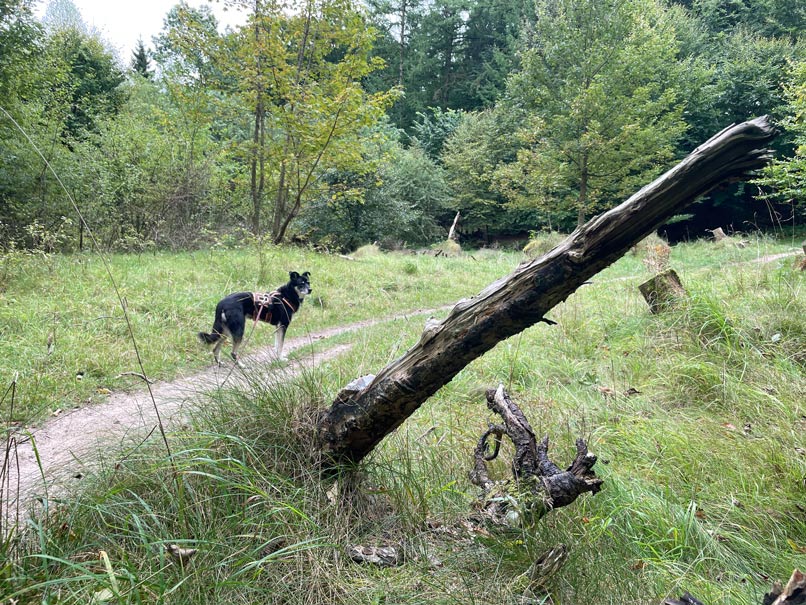 Auf dem Rückweg schließen wir uns einem Mann mit Hund an. Er stammt nicht von hier, sondern ist vor einigen Jahren mit seiner Frau und Hund aus Nordrhein-Westfalen hergezogen. Darüber unterhalten wir uns, genauso wie über unsere Hunde und über Hundestrände, während wir uns über den Pfad durch den Wald schlängeln. Als wir auf einem breiten Waldweg ankommen, trennen sich unsere Wege. Alex und ich wandern zurück zum Parkplatz Nordschauwald. Insgesamt waren das dann etwa viereinhalb Kilometer.