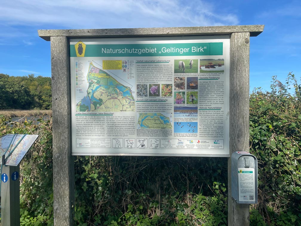 Am nächsten Tag machen mein Hund und ich uns auf zum Nordschauwald zwischen Geltinger-Birk und Wackerbalig. Die Äste tanzen expressiv im Wind. Mancher würde vielleicht sagen, es stürmt, aber wie hieß es einmal in einer Werbung des NDRs: „Sturm ist, wenn die Schafe keine Locken mehr haben.“ Zwar sehe ich keine Schafe, aber Alex Ohrenspitzen hängen noch. Mein Indiz für die Windstärke. Während wir durch den Nordschauwald wandern, frage ich mich trotzdem zwischendurch, ob es schlau ist, bei dem Wetter durch den Wald zu wandern. Aber umdrehen tun wir nicht. Wir wandern immer weiter. Stück für Stück mit vielen Schnüffelpausen. Der kleine Küstenwald liegt an der Flensburger Förde und bietet verschiedene kleine Wanderwege. Wir wandern parallel zum Hauptweg auf einem schmaleren Pfad, der aus Waldboden besteht. Am Wegesrand tauchen immer wieder Informationsschilder auf, die über die Natur informieren.