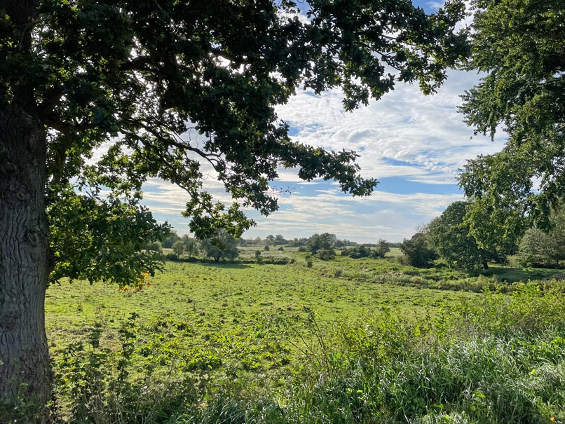 Am Parkplatz bei der Schleuse Neukirchen/Habernis führen verschiedene Wanderwege vorbei. Wir begeben uns auf einen, der uns ins Habernisser Moor führt. An einem kleinen Bach entlang, vorbei an Gräsern und Blumen, über Feuchtwiesen. Die Sonne küsst bald den Boden. Es dämmert, aber ein bisschen möchte ich noch mit meinem Hund wandern. Seine Pfoten heben und senken sich aber immer nur zwei- bis dreimal, dann verharren sie wieder auf dem Wanderweg.