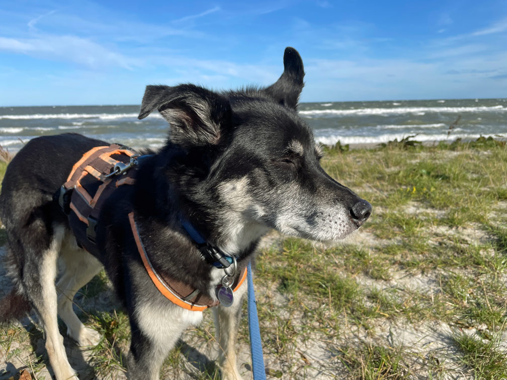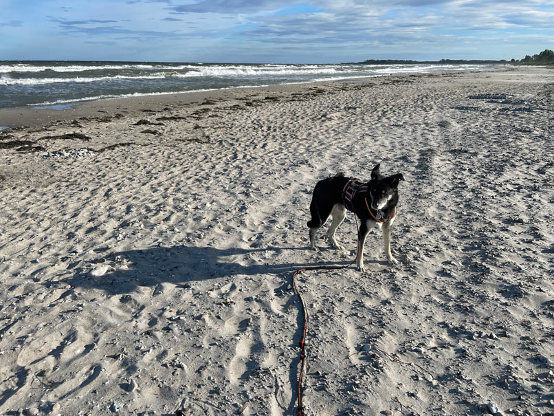 Nur wenn ich Alex anschaue, empfinde ich solch eine tiefe Freude. Ansonsten kann ich mich nicht erinnern, wann ich das letzte Mal so überglücklich war. Die letzten Jahre und insbesondere dieses waren hart. Es waren zwar auch viele schöne Momente dabei, auch mit Freudentränen und vor allem mit Alex, aber endlich wieder am Meer zu sein, toppt sie fast alle. Nur Alex an meiner Seite zu haben, bleibt mit Abstand die unangefochtene Nummer Eins. Zumal es auch anders hätte sein können (mehr über unsere Herausforderungen der letzten Jahre erfährst Du in meinen Blogartikeln „Schlaflos im Zelt mit Hund“ „Nur ein einfacher Forstweg“ „Endlich wieder wandern mit Hund“ Erste Hilfe am Hund: „Blutung stillen mit Druckverband“ und „Das Ende der Mohnblüte“).
